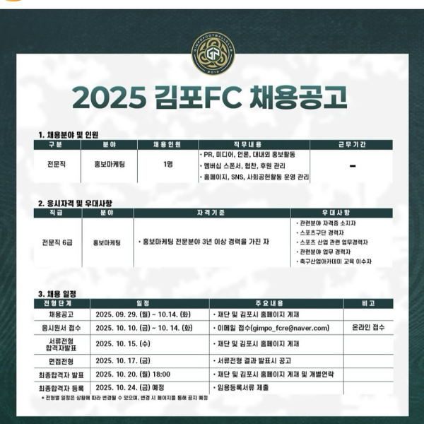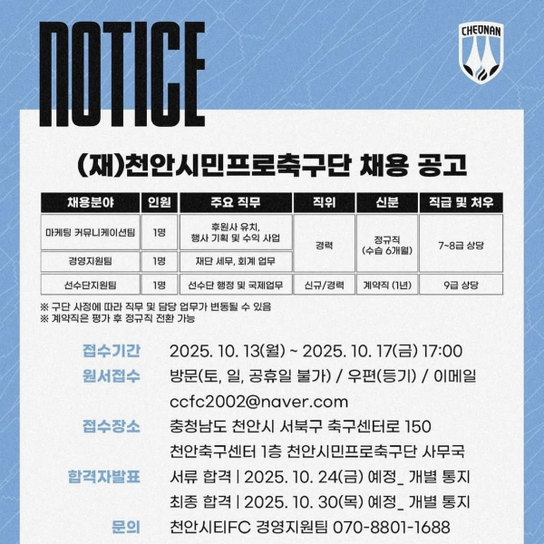 [(재)천안시민프로축구단] 직원 (경력/신입) 채용