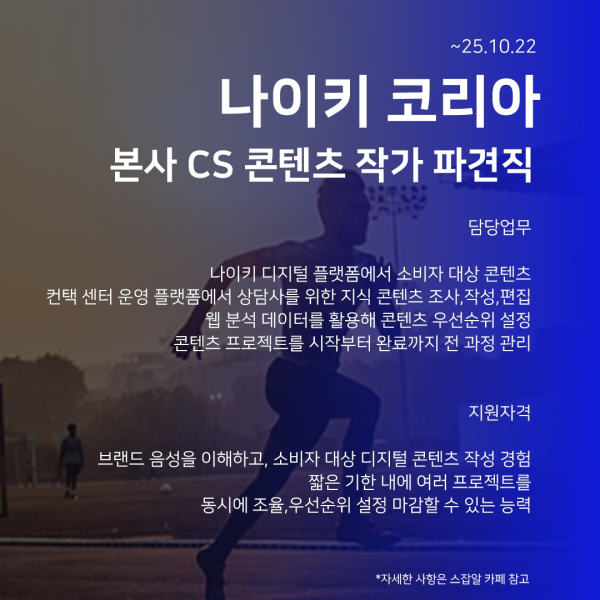 [나이키코리아] 본사 CS 콘텐츠 작가 파견직 채용