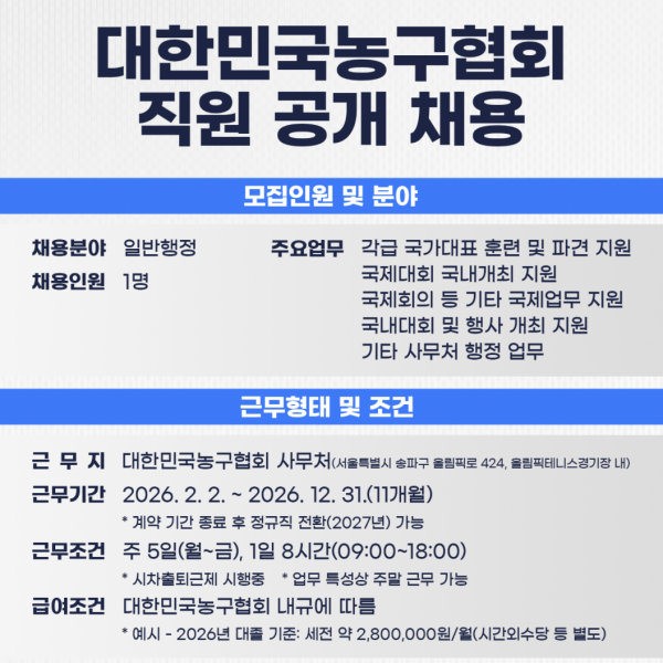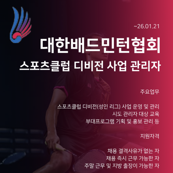 [대한배드민턴협회] 2026 스포츠클럽 디비전(성인 리그) 사업 관리자 채용