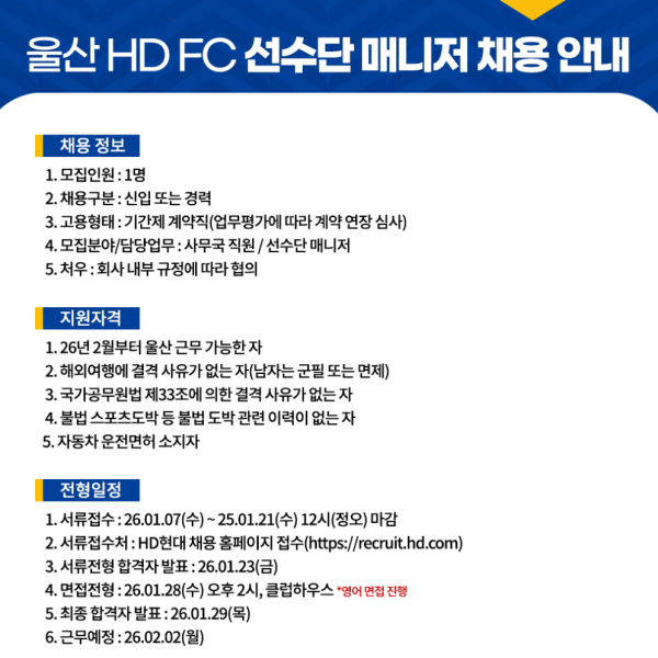 울산 HD FC 선수단 매니저 채용 안내