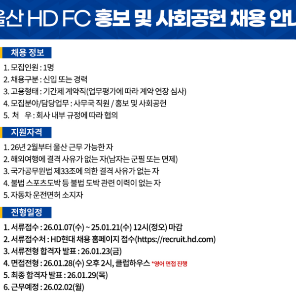 울산 HD FC 홍보 및 사회공헌 채용 안내
