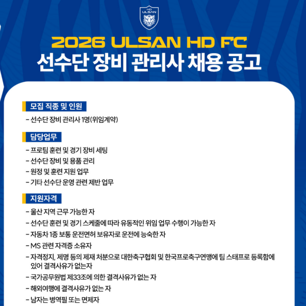 2026년 울산 HD FC 선수단 장비 관리사 채용 안내
