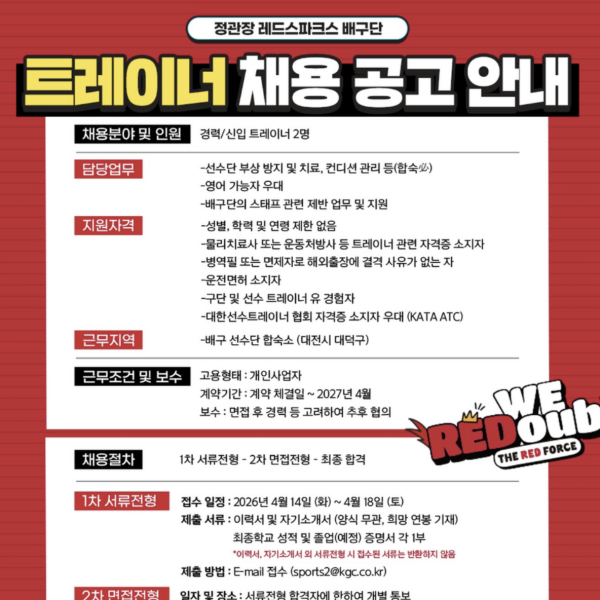 [정관장 레드스파크스] 배구단 트레이너 채용 공고