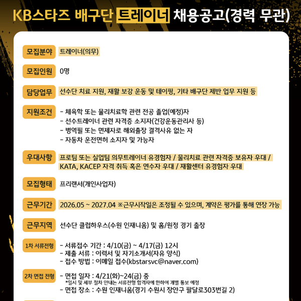 [KB손해보험 스타즈 배구단] 트레이너 채용 모집 공고(경력 무관)