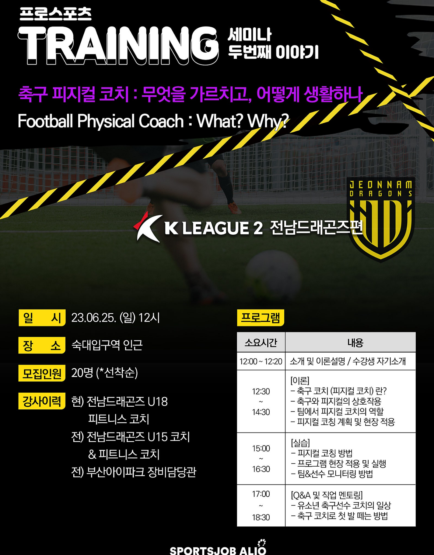 전남드래곤즈 U18 피지컬 코치로 활동중인 이정우 코치님과 함께 현장 트레이닝법을 배워보고 직접 선수들에게 접목되는 모니터링 프로그램까지 배워보자!!