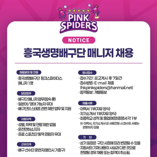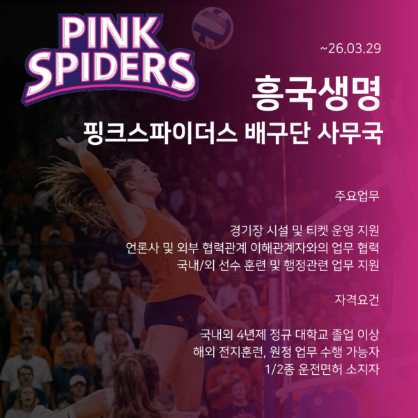 [흥국생명] 배구단 핑크스파이더스 사무국 직원 채용