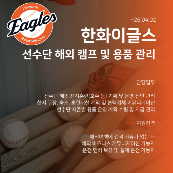 [(주)한화이글스] 선수단 해외 캠프 및 용품 관리 채용