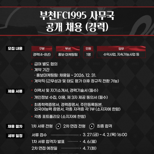 [부천FC1995] 사무국 직원 공개채용 (경력, 홍보마케팅팀)