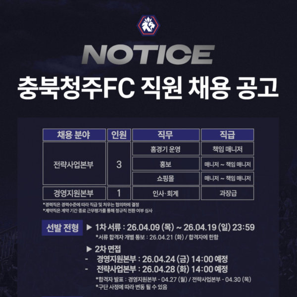 [충북청주프로축구단] 경영지원본부 및 전략사업본부 경력/신규 채용