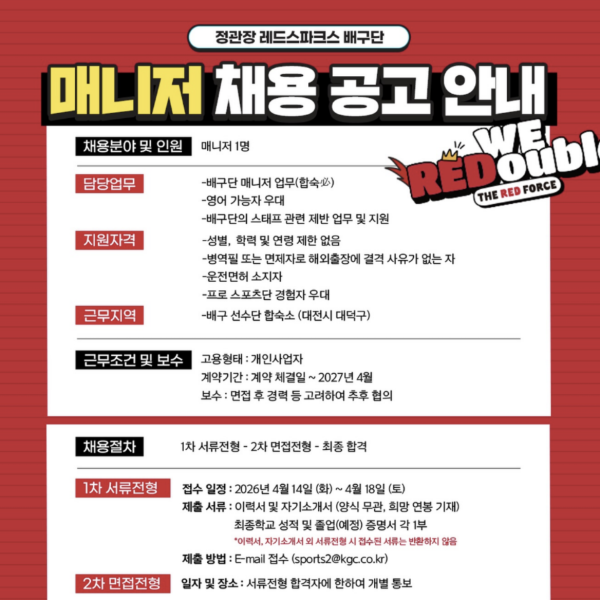 [정관장 레드스파크스] 배구단 매니저 채용 공고